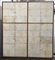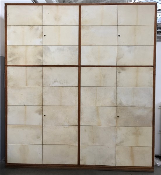 Armadio "quattro stagioni" a sei ante, interamente decorato con pannelli rettangolari rivestiti in pergamena. Italia, anni '50. (cm 300x270x66) (difetti)