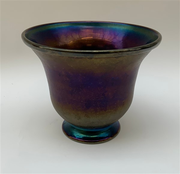 Vaso in vetro soffiato fortemente iridato e corrugato sulla superficie esterna. Secolo XX. (h cm 15,5)