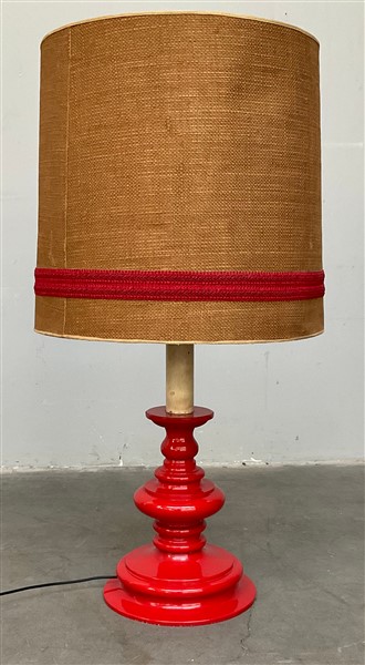 Lampada da tavolo con struttura in metallo verniciato rosso, paralume rivestito in tessuto. Italia, anni '70. (h cm 85) (Difetti al paralume)