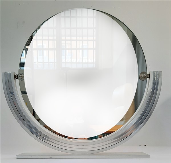 Specchio da tavolo basculante con struttura in alluminio anodizzato e metallo cromato. Italia, anni '70. (d specchio cm 44,5) (lievi difetti)