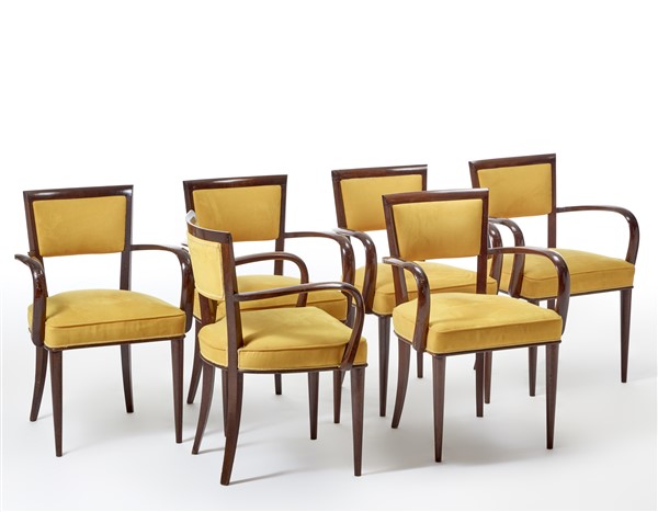 Lotto composto da sei poltroncine con seduta imbottita e rivestita in alcantara giallo, struttura in legno massello di mogano. Gambe anteriori troncoconiche. Italia, anni '50. (cm 60x83,5x52) (lievi difetti e restauri, gravi difetti su un esemplare)