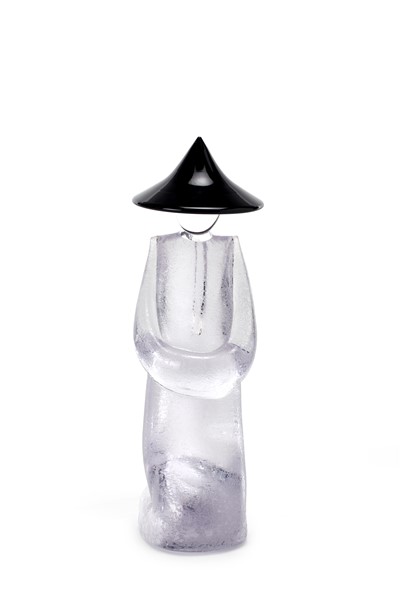 Scultura raffigurante un mandarino orientale. Murano, seconda metà secolo XX. Vetro trasparente incolore corroso sulla superficie esterna, cappello in vetro nero. Firmata a punta alla base. (h cm 51)