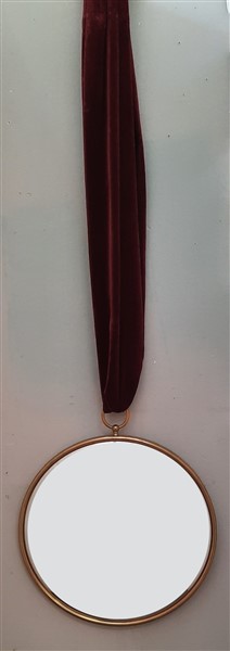 Specchio modello "Magico". Milano, anni 2000. Cornice in ottone, velluto rosso. Recante etichetta adesiva del produttore al retro. In scatola originale. (d cm 50)