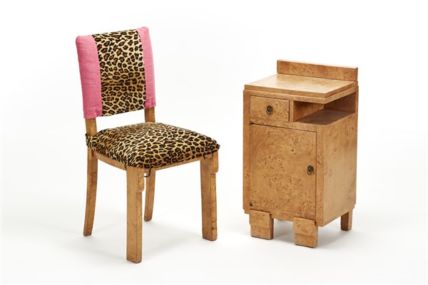 Lotto composto da un comodino con anta e cassettino unito a una sedia con struttura in legno, seduta e schienale imbottiti e rivestiti in tessuto. Italia, anni '40. (comodino cm 40x75x33; sedia cm 45x91x42,5) (difetti e piccoli restauri)
