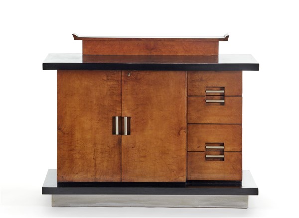 Credenza Novecento impiallacciata in radica con base e maniglie in anticorodal,