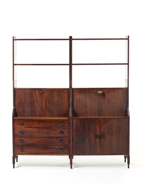 Mobile modello "SC80" a quattro ripiani a giorno nella parte superiore, due stipi a ribalta nella parte centrale, quattro cassetti e stipo a doppia anta nella parte inferiore. Produzione Sormani, Arosio, anni '60. Struttura in legno massello bordato, multistrato e impiallacciato, maniglie in ottone. (cm 160x182x43) (difetti)