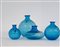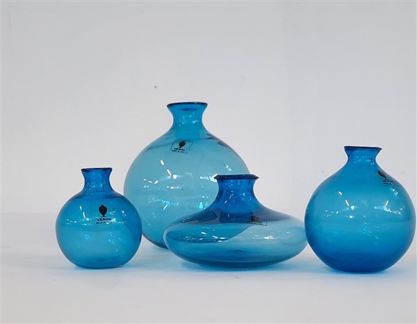Lotto composto da quattro vasi monofiori di diverse dimensioni in vetro soffiato trasparente azzurro con orlo blu. Murano, 1980-1981. Firmati e datati a punta sotto la base e recanti etichetta adesiva della produzione. (h max cm 12)