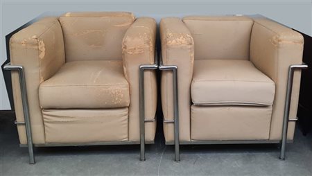 Coppia di poltrone modello "LC2". Produzione Cassina, Meda, anni '70. Struttura in tubolare metallico, seduta e schienale imbottiti e rivestiti in pelle beige. Recanti etichetta della produzione. (cm 75x70x70) (gravi difetti)