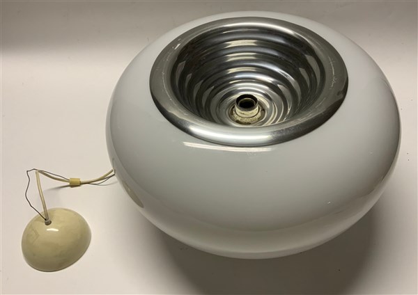 Lampada a sospensione modello "Black and White". Produzione Flos, Milano, anni '60. Paralume in vetro soffiato lattimo e struttura in alluminio. Marchio della produzione. (d cm 50)