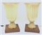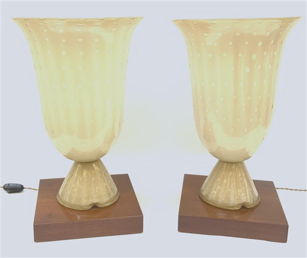 Coppia di lampade da tavolo in vetro incamiciato lattimo e pagliesco lievemente costolato con bolle disposte regolarmente e applicazione di foglia d'oro. Base in legno. Italia, secolo XX. (h cm 52)