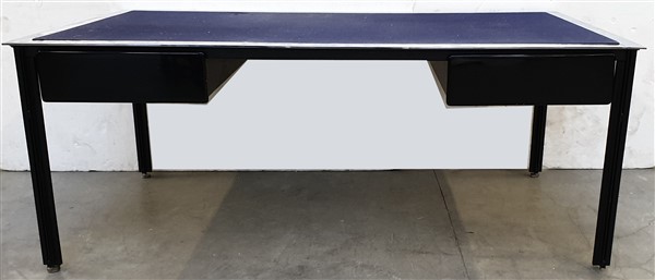 Grande scrivania da centro della serie "Fasce Cromate". Produzione Azucena, Milano, anni '70. Struttura in metallo verniciato nero, piedini regolabili, fasce perimetrali in ottone cromato, piano rivestito in tessuto blu e quattro cassetti in legno laccato nero. (cm 190x77x110) (difetti e mancanze)