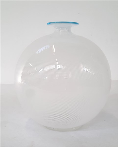 Vaso globulare in vetro soffiato trasparente incolore a mezza filigrana lattimo con orlo applicato in vetro azzurro. Murano, anni '80/'90. Firmato a punta sotto la base. (h cm 20,5)