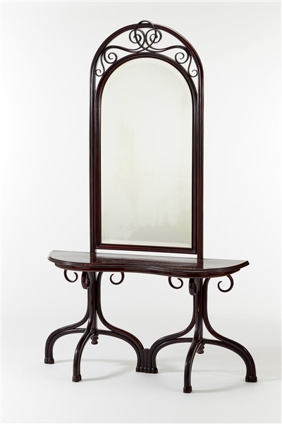 Consolle di forma mossa con alzata a specchio terminante con cimasa traforata. Austria, 1910-18. Legno di faggio curvato al vapore. Parte inferiore costruita con gli stampi dellattaccapanni modello 10.90; parte superiore derivante dagli stampi della specchiera modello 9951. (cm 125x224x40) (difetti)
