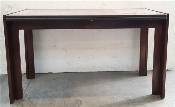 Tavolo in legno massello e bordato. Produzione Cassina, Italia, anni '70. Recante etichetta adesiva. (Tavolo chiuso cm 130x75x75) (difetti)