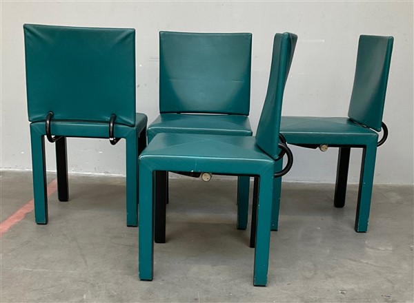 Gruppo di quattro sedie modello "Arcara". Produzione B&B, Italia, anni '80. Struttura in metallo, plastica, rivestimento in pelle verde. Recanti marchio del produttore sotto la seduta. (cm 46x88x55) (difetti)