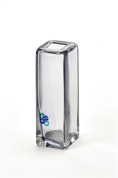 Vaso di forma parallelepipeda della serie "Oh, che bei!". Esecuzione Luciano Vistosi, Murano, anni '60. Vetro trasparente grigio con murrine policrome. Esemplari analoghi furono presentati alla XXXII Biennale di Venezia del 1964. (cm 6,5x16,8x5,5)