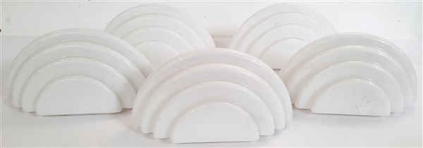 Lotto composto da cinque lampade da parete modello "Kumo 1". Produzione Sirrah, Imola, 1983. Alluminio smaltato bianco, vetro incamiciato lattimo sagomato. Recanti etichetta cartacea sulla struttura. (l cm 33) (difetti a un esemplare)