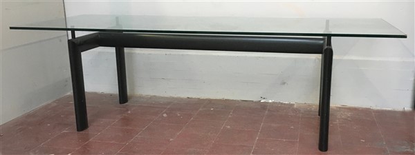Tavolo modello "LC6". Produzione Cassina, Meda, anni '70. Struttura in acciaio verniciato nero, piano in cristallo. (cm 224,5x68,5x85,5) (difetti e mancanze)