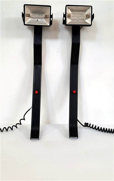 Coppia di lampade da parete della serie "Sirio". Produzione Sirrah, Imola, 1977. Acciaio laccato nero opaco. Un esemplare recante etichetta cartacea della produzione all'interno. (h cm 71) (lievi difetti)