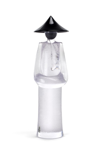 Scultura raffigurante un mandarino orientale. Murano, seconda metà secolo XX. Vetro trasparente incolore corroso sulla superficie esterna, cappello in vetro nero. Firmata a punta alla base e recante etichetta adesiva. (h cm 60)