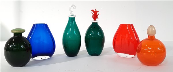 Lotto composto da sei vasi dei quali due della serie "Linee" in vetro trasparente rosso e blu, due della serie "Monofiori" di Laura de Santillana in vetro trasparente verde con tappo a corallo e a ricciolo, uno della serie "Le Veneziane - Ca' Rezzonico e Rialto" in vetro trasparente arancione e verde con tappo. Murano, dagli anni '80 agli anni 2000. Firmati e datati a punta sotto la base. (dimensioni diverse) (lievi difetti)