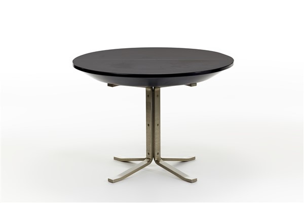 Tavolo da pranzo allungabile. Produzione Formanova, Meda, anni '60. Piano circolare in legno, struttura in acciaio spazzolato. (tavolo chiuso h cm 76; d cm 110)