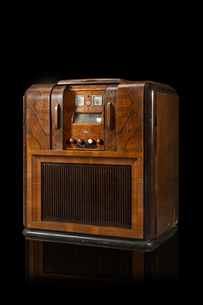 Mobile radio a valvole modello "I.F.92 multigamma". Produzione S.A.IMCA RADIO, Alessandria, anni '30. Radica e legno impiallacciato. (cm 90x101,5x56) (difetti e mancanza del giradischi)
