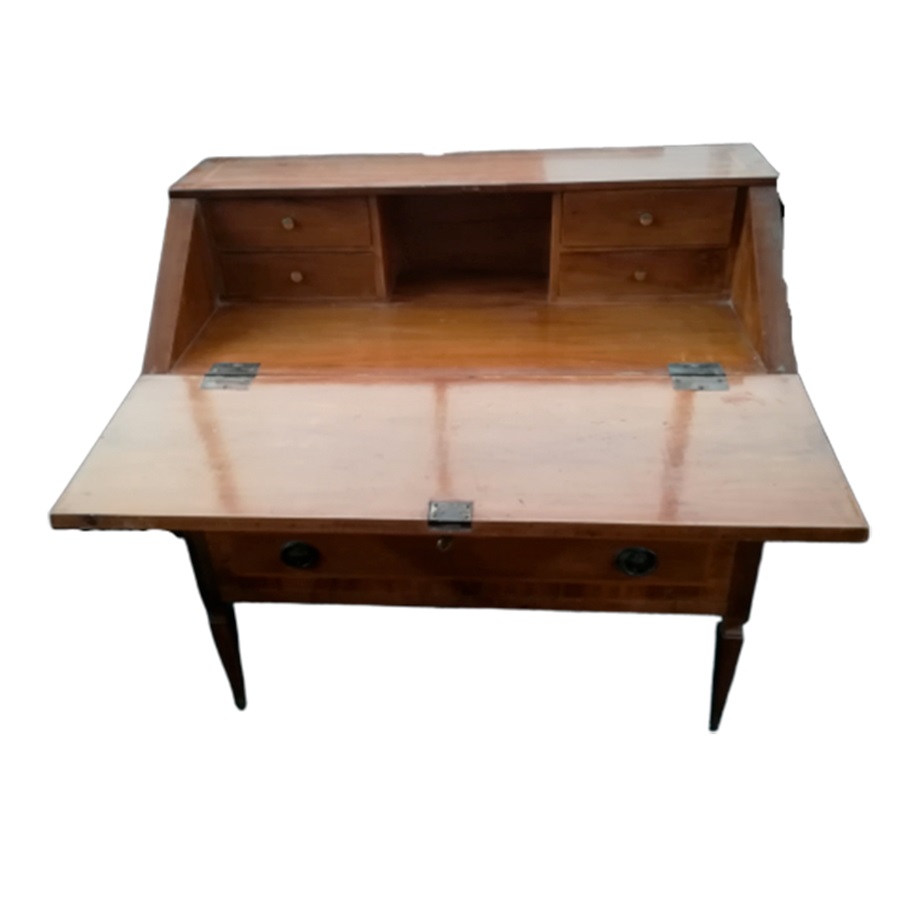 in noce fronte a due cassetti e ribalta con all¿interno vano a giorno e quattro cassettini, gambe troncopiramidali
