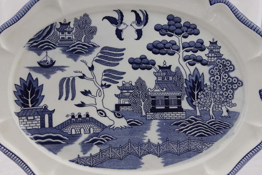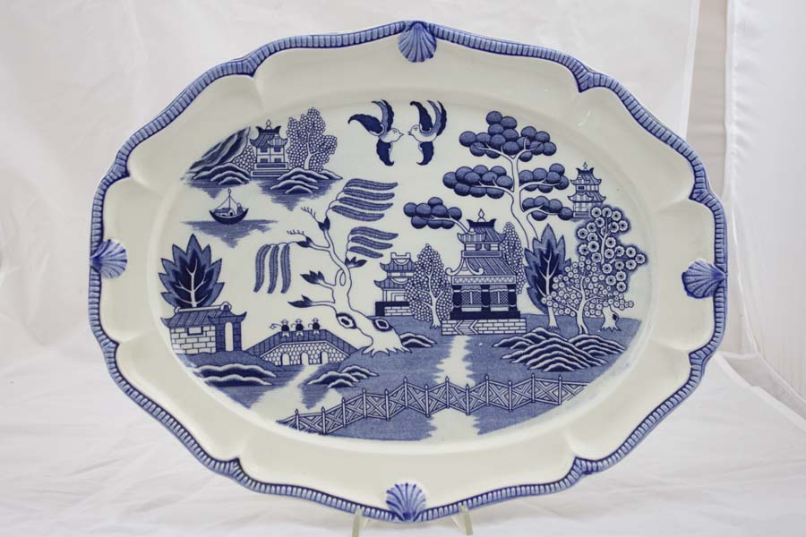 in ceramica bianca decorata a monocromo blu con motivo del Salice Piangente, bordo smerlato con profilo in blu e arricchito da quattro piccole conchiglie