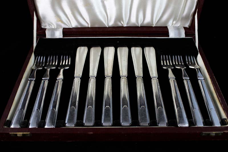 in sheffield, composto da sei forchette e sei coltelli, entro custodia originale, (7)
