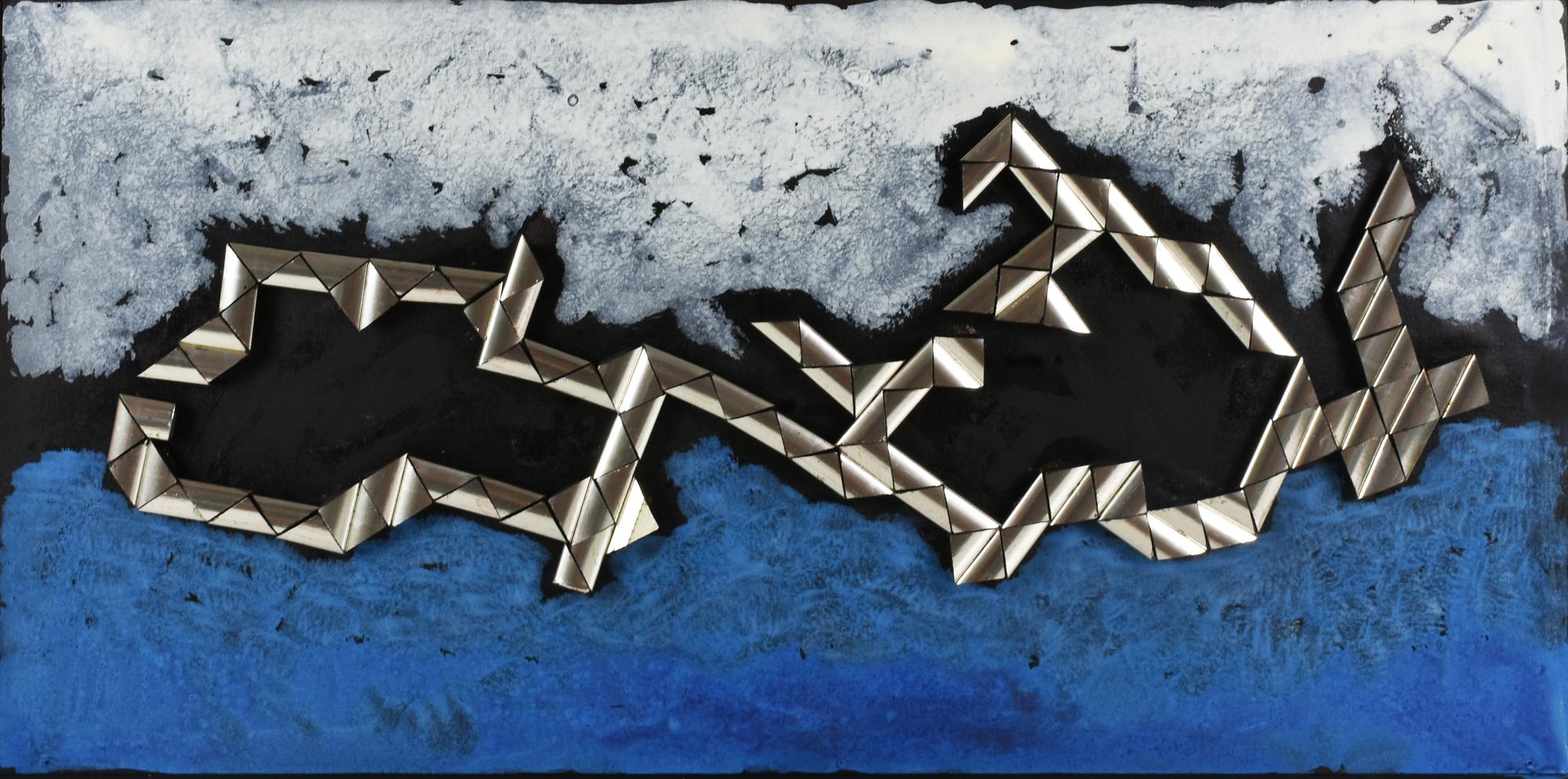 tecnica mista e applicazioni su tela applicata su tavola, cm 50x100
