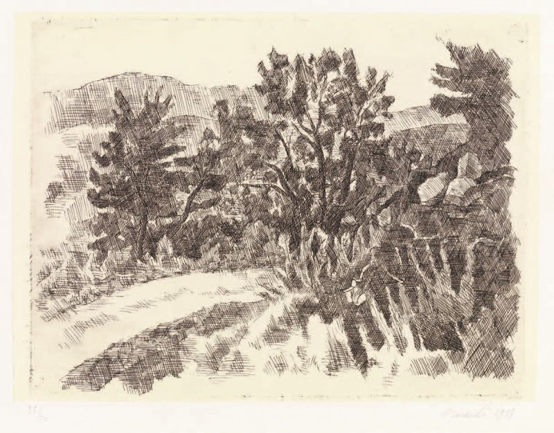 Giorgio Morandi Bologna 1890 - 1964 La strada, 1927 Acquaforte su zinco, su carta India incollata, es. 35/50, cm. 19,5x26,1 (lastra), cm. 28,8x44,1 (carta) Firma e data a matita sul margine in basso a destra: Morandi 1927, tiratura in basso a sinistra: 35/50. Primo stato su due: tiratura di 50 esemplari, di cui due non numerati e gli altri numerati dal 3 al 50, alcuni su carta India incollata, e una prova di stampa. Bibliografia Lamberto Vitali, L'opera grafica di Giorgio Morandi, Giulio Einaudi Editore, Torino, 1964, n. 30; Michele Cordaro, Morandi incisioni. Catalogo Generale, Edizioni Electa, Milano, 1991, p. 34, n. 1927 1.