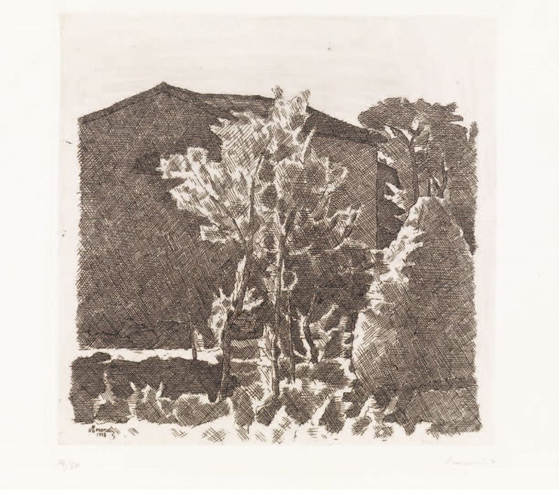 Giorgio Morandi Bologna 1890 - 1964 Il Poggio al mattino, 1928 Acquaforte su zinco, es. 14/50, cm. 24,8x24,8 (lastra), cm. 32,6x38 (carta) Firma e data in lastra in basso a sinistra: Morandi / 1928, firma a matita sul margine in basso a destra: Morandi, tiratura in basso a sinistra: 14/50, timbro a secco Libreria / Prandi / Reggio / E. Secondo stato su tre: tiratura di 50 esemplari numerati, oltre tre prove di stampa. Bibliografia Lamberto Vitali, L'opera grafica di Giorgio Morandi, Giulio Einaudi Editore, Torino, 1964, n. 44; Michele Cordaro, Morandi incisioni. Catalogo Generale, Edizioni Electa, Milano, 1991, p. 51, n. 1928 4.