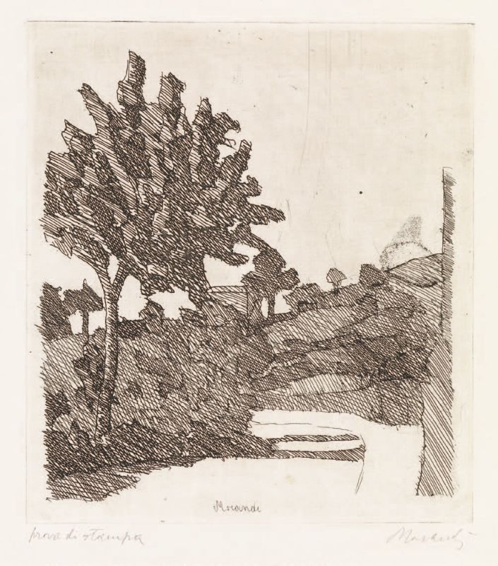 Giorgio Morandi Bologna 1890 - 1964 Paesaggio di Grizzana, 1932 Acquaforte su rame, es. prova di stampa, cm. 19,7x17,7 (lastra), cm. 37,9x26,6 (carta) Firma in lastra in basso al centro: Morandi, firma a matita sul margine in basso a destra: Morandi, tiratura in basso a sinistra: prova di stampa. Primo stato su due: tiratura di 30 esemplari numerati, du cui alcuni si carta India incollata, e una prova di stampa. Bibliografia Lamberto Vitali, L'opera grafica di Giorgio Morandi, Giulio Einaudi Editore, Torino, 1964, n. 95; Michele Cordaro, Morandi incisioni. Catalogo Generale, Edizioni Electa, Milano, 1991, p. 109, n. 1932 5.