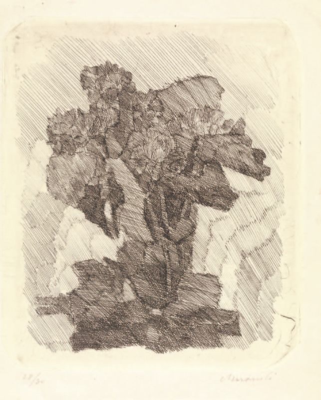 Giorgio Morandi Bologna 1890 - 1964 Gerani dentro un bicchiere, 1930 ca. Acquaforte su rame, su carta India incollata, es. 28/30, cm. 19,8x16,5 (lastra), cm. 32,8x24,7 (carta) Firma a matita sul margine in basso a destra: Morandi, tiratura in basso a sinistra: 28/30. Secondo stato su tre: tiratura di 30 esemplari numerati, di cui alcuni su carta India incollata. Bibliografia Lamberto Vitali, L'opera grafica di Giorgio Morandi, Giulio Einaudi Editore, Torino, 1964, n. 79; Michele Cordaro, Morandi incisioni. Catalogo Generale, Edizioni Electa, Milano, 1991, p. 90, n. 1930 12.