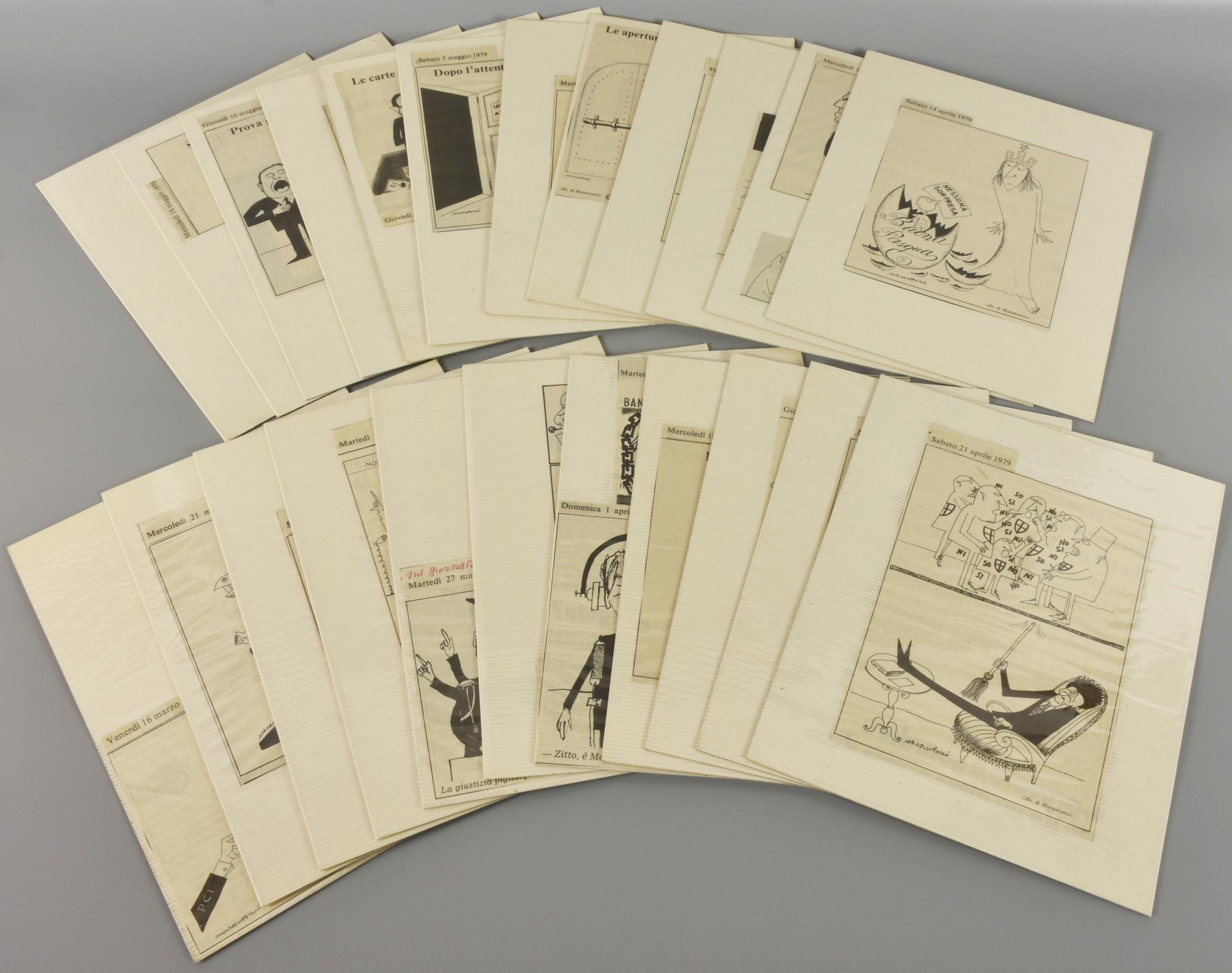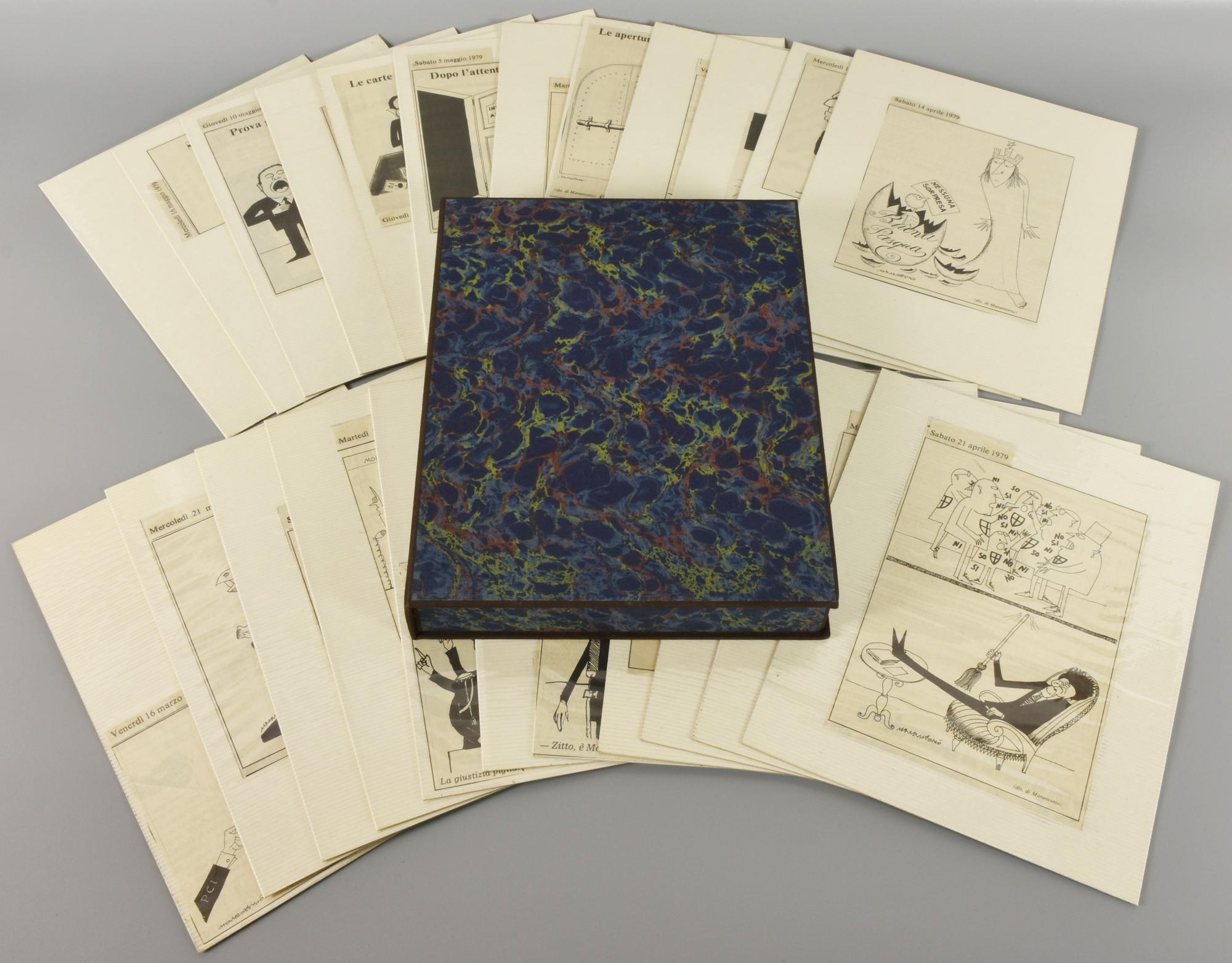 cofanetto di vignette satiriche ritagliate da "Il giornale" e incollate su 23 cartoncini, cofanetto cm 27x21,5x4, cartoncini cm 25x20