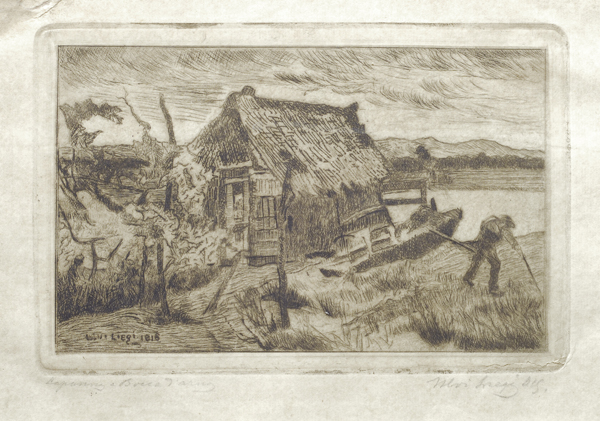 Ulvi Liegi (Livorno, 1858 - 1939) CAPANNO A BOCCA D’ARNO Acquaforte su carta., cm. 15x21,5 Firma in basso a destra. Titolo in basso a sinistra.