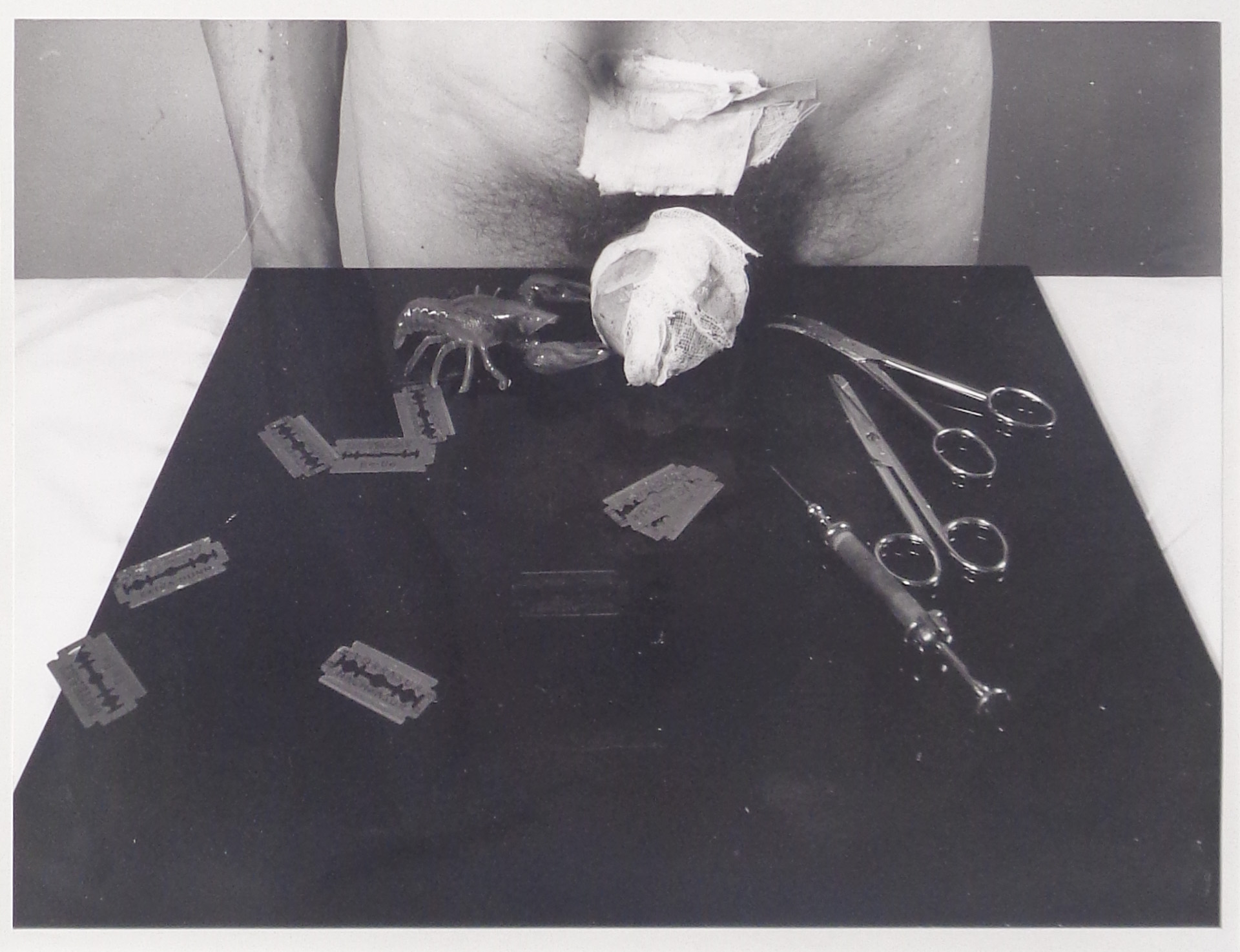 Rudolf Schwarzkogler (Wien/Vienna 1940 – 1969) 5. Aktion Wien Sommer 1965, 1982;Fotografia applicata su cartoncino, 30,4 x 40,2 cm, al retro timbro e firma Edith Adam. Fotografia n. 17 della cartella edita dalla galleria Krinzinger contenente 60 fotografie; numerazione (30/40)