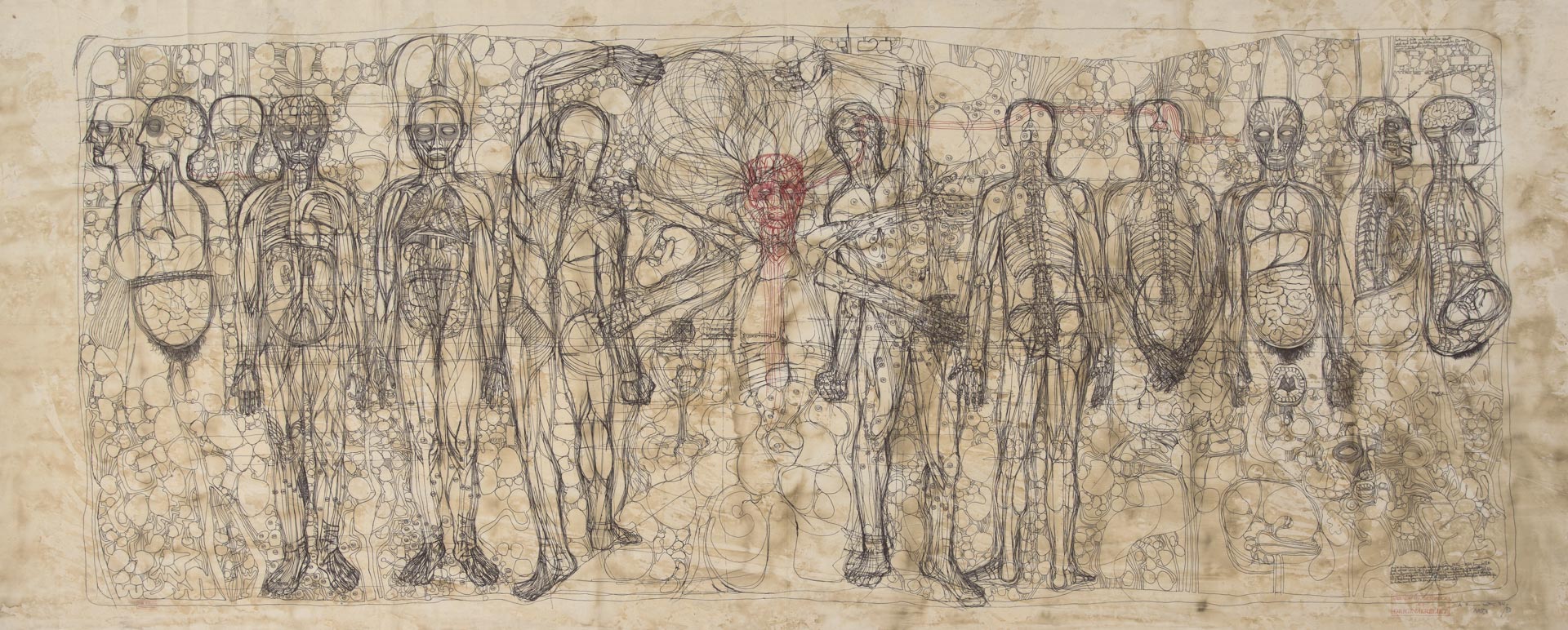 Hermann Nitsch (Wien/Vienna 1938) L’ultima cena, 1984;Serigrafia su relitto originale, tessuto, 166 x 389 cm