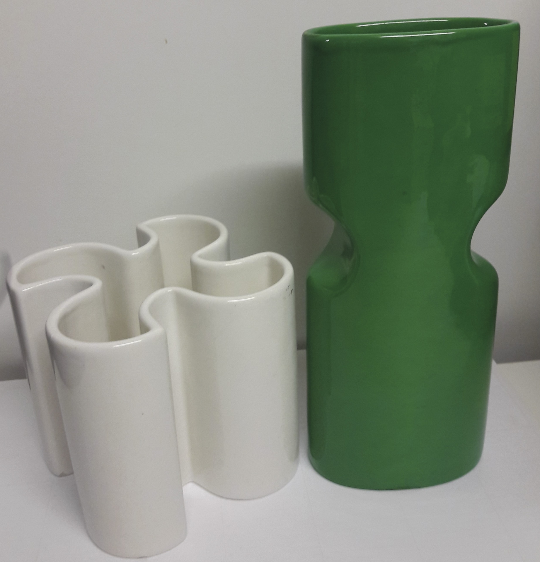 Franco Bettonica Due vasi, Anni ‘60;a smalto bianco e verde, h. 29,5 x 12 x 7 cm e 15 x 15 cm, produzione Gabbianelli, piccole mancanze sotto il vaso bianco e lieve restauro sul verde, in buono stato