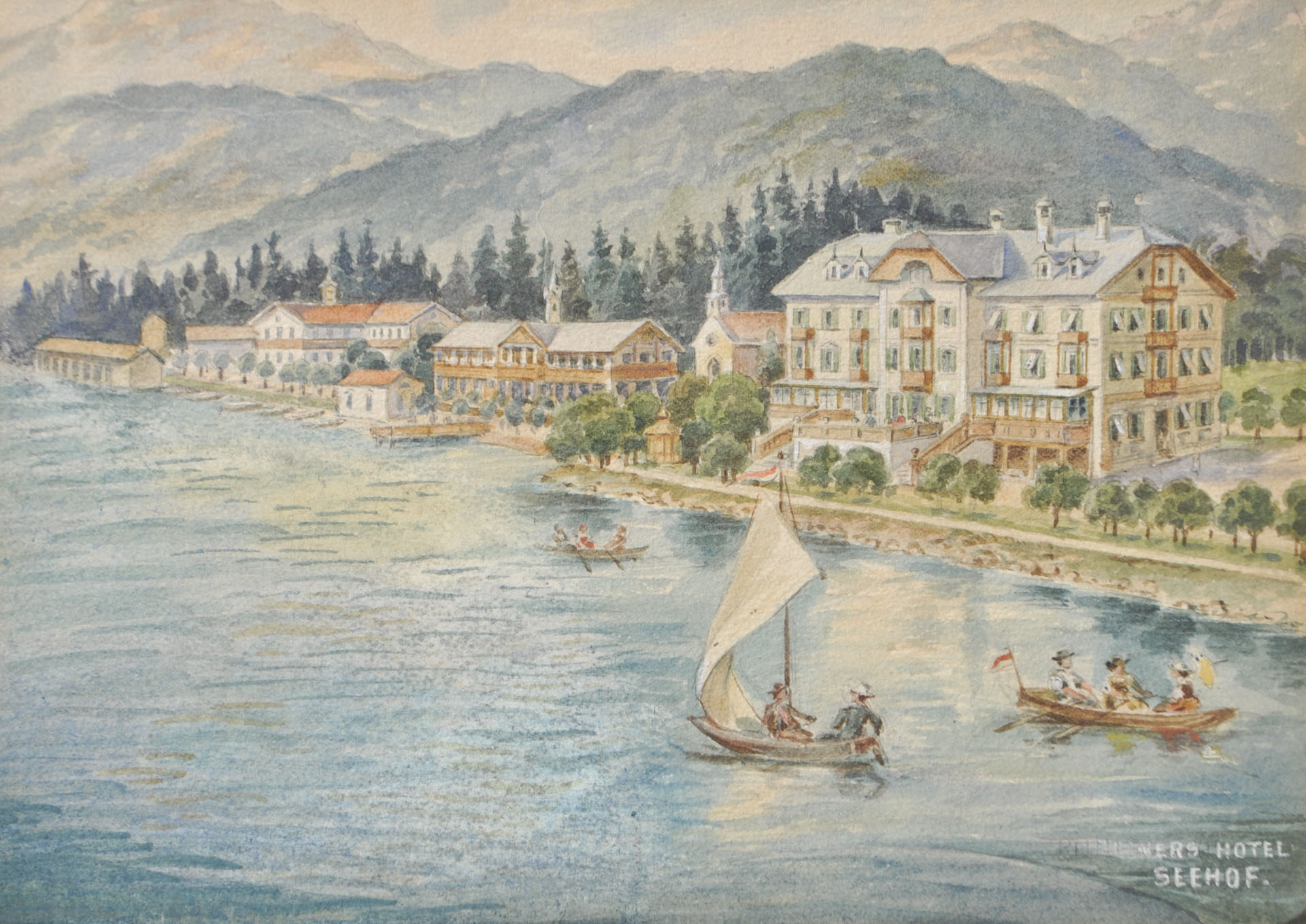 A. Ringler Hotel Seehof, lago Achensee, 1904;Acquerello per il manifesto “Der...