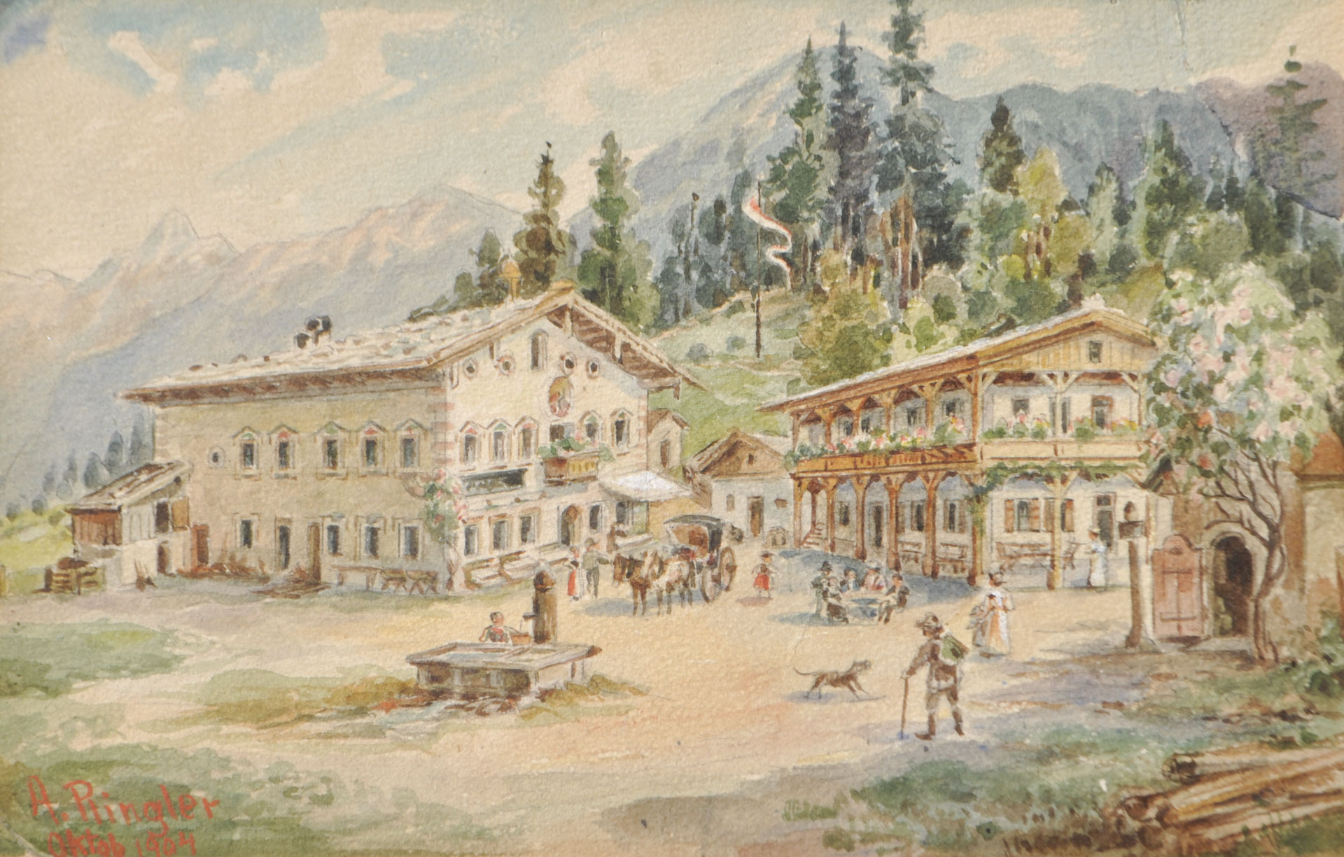 A. Ringler Jos. Prantl albergo Buchau, lago Achensee, 1904;Acquerello per il...