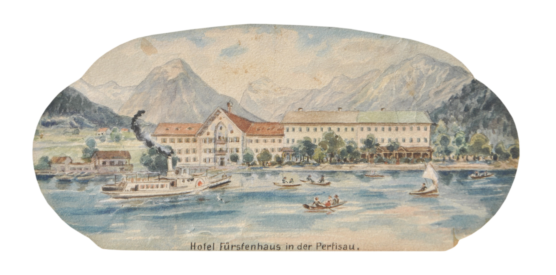 A. Ringler Hotel Fürstenhof a Pertisau 1904;Acquerello per il manifesto “Der Achensee