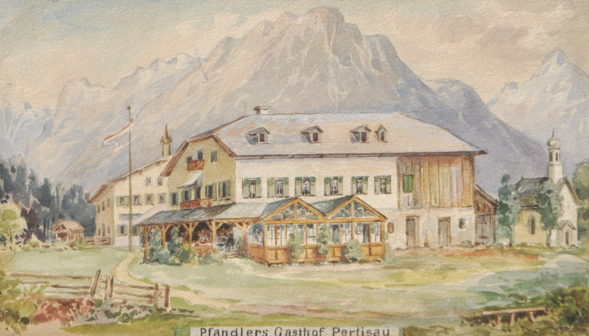 A. Ringler Pfandlers Gasthof, Pertisau, lago Achensee, 1904;Acquerello, 11 x 19,5 cm, in cornice