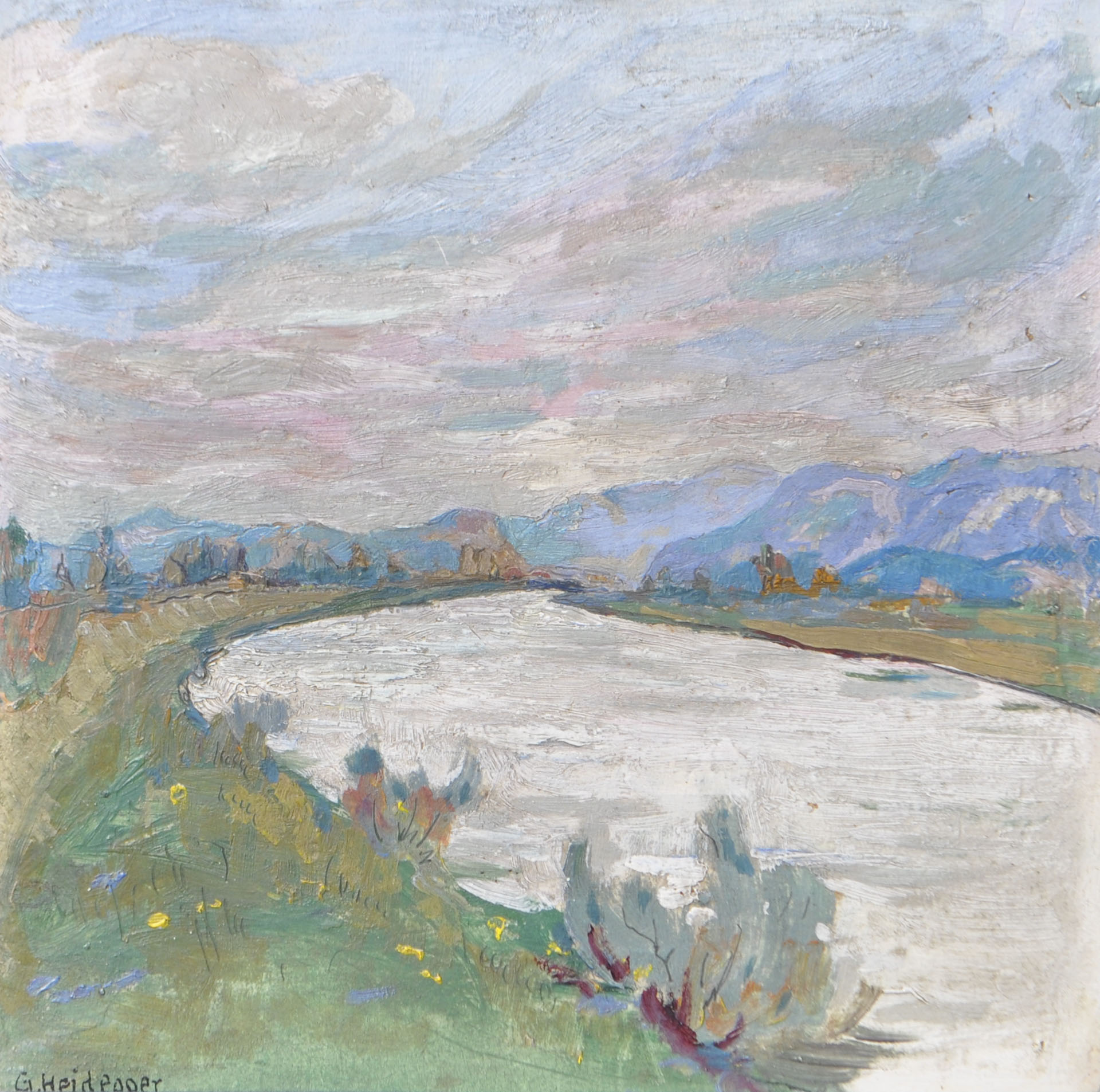 Gilbert Heidegger (Margreid/Magré 1872 – Innsbruck 1956) L’Adige in Bassa Atesina;Olio su cartone, 24 x 24 cm, in cornice