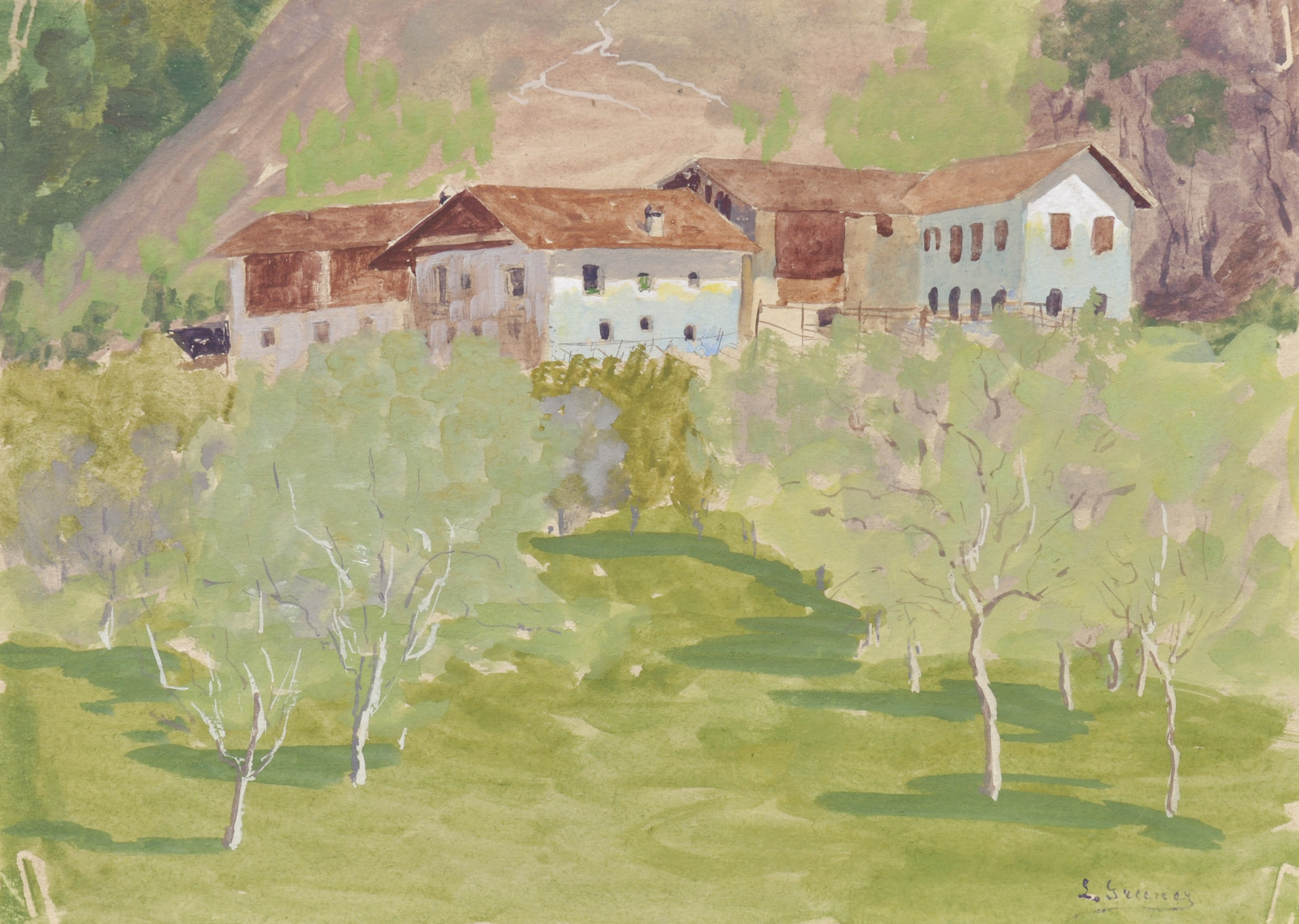 Lila Gruner (Guntramsdorf 1870 –Wien/Vienna 1950) Masi in Maia Alta, Merano, 1930 ca.;Guazzo, 23,2 x 32,6 cm