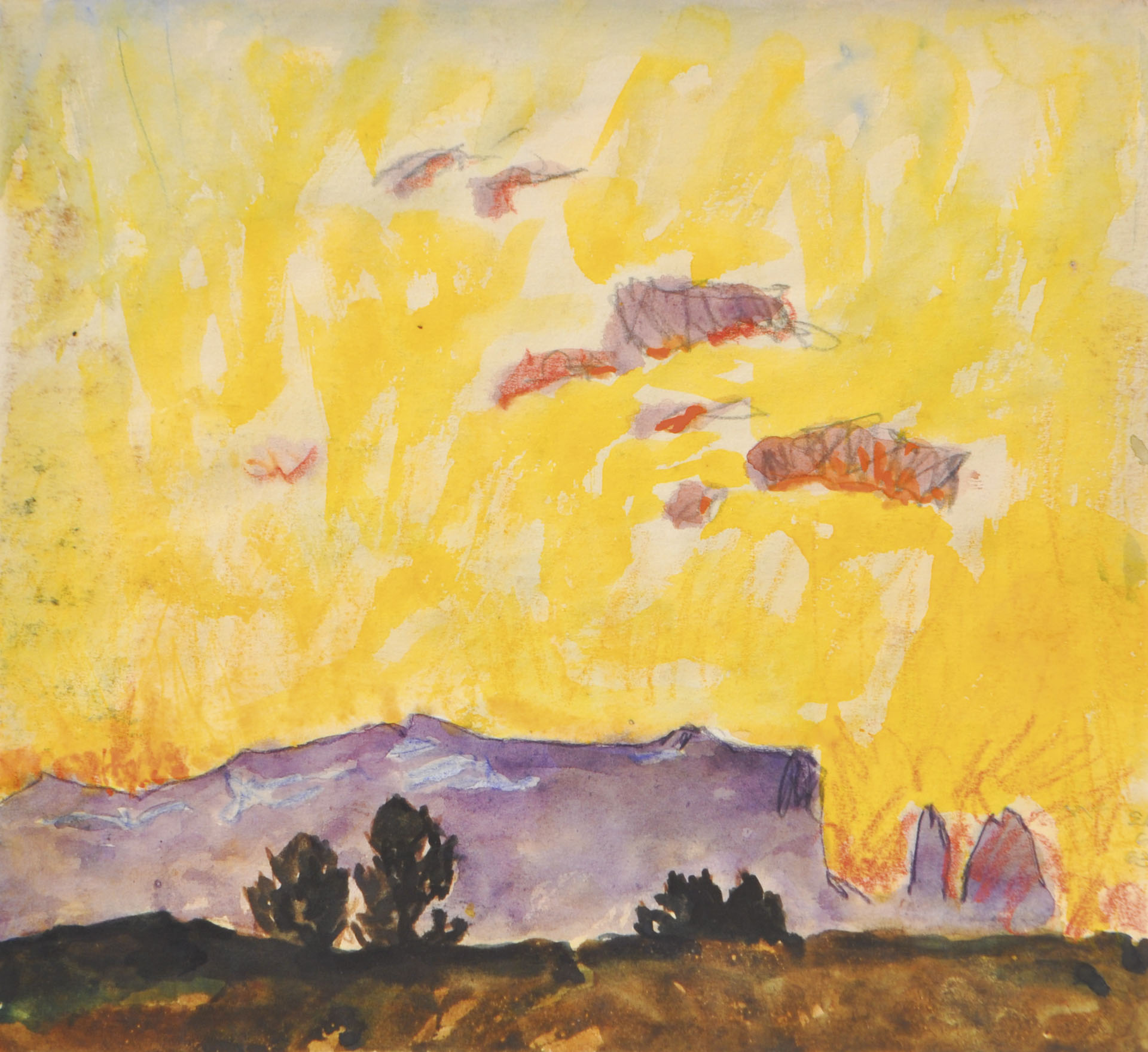 Josef Meng (Heideck 1887 – Kufstein 1974) Sciliar nel rosso di sera, 1963;Acquerello, matite colorate e matita su carta,
