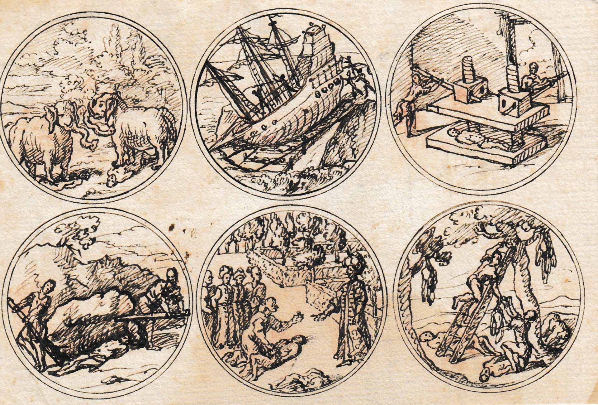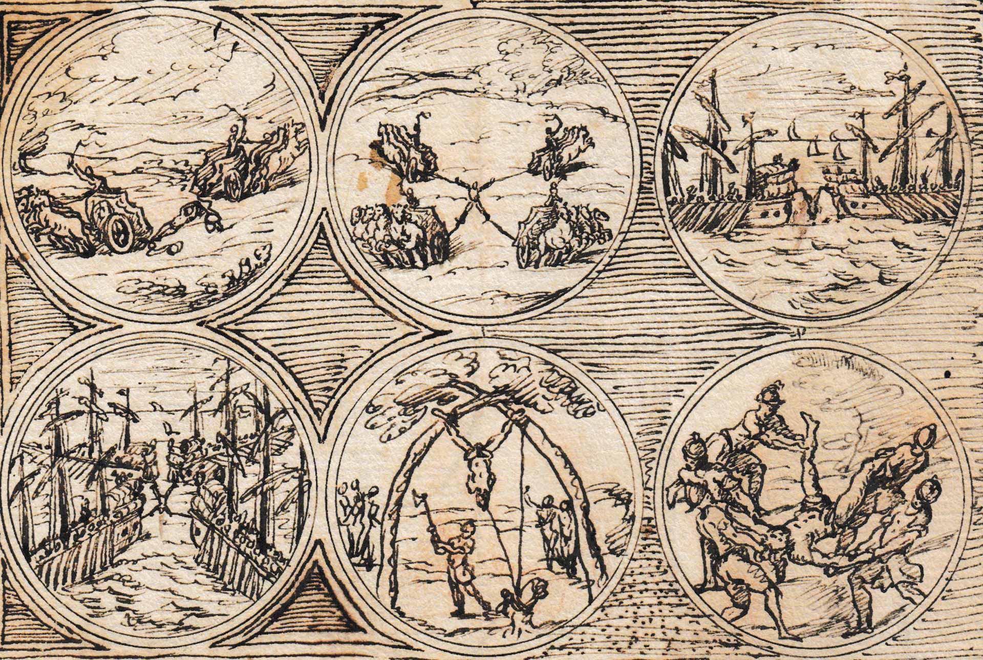Italienischer Künstler um 1600/Artista italiano del XVII sec. Scene di tortura;17 fogli, ognuno con 6 rappresentazioni, china, dimensione dei fogli ca. 13,5 x 19,7 cm, danni dovuti all’età. Sul retro in parte altre rappresentazioni, su un foglio testo italiano che non sembra riferirsi direttamente ai disegni: Silvestro Mondin/ro (?) Piemontese d`Anni 16 circa
