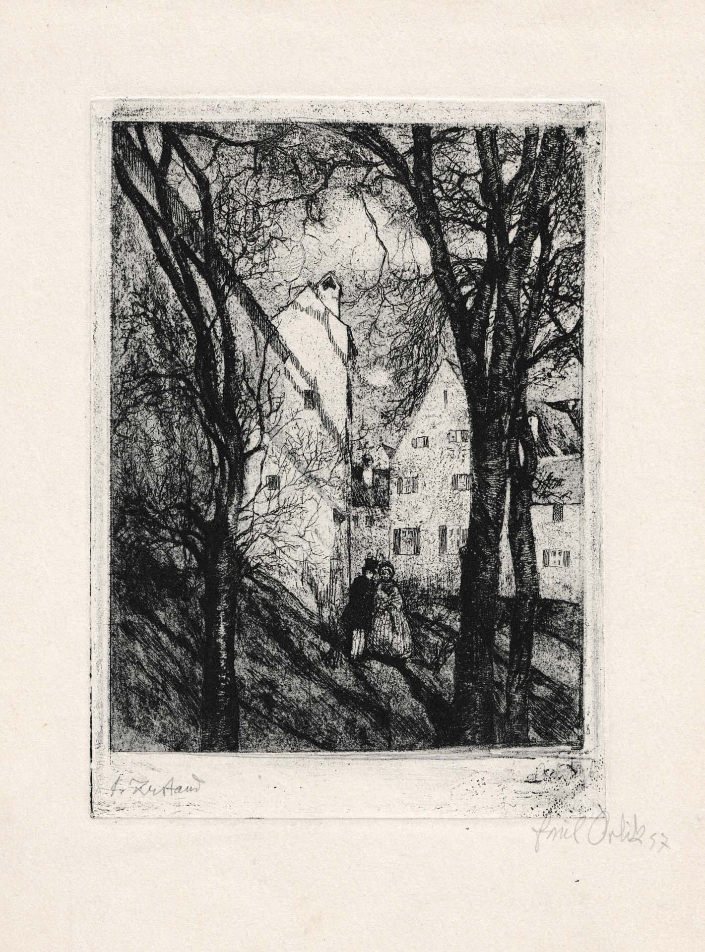 Emil Orlik (Prag/Praga 1870 – Berlin/Berlino 1932) Motivo di città con coppia stile Biedermeier, 1897;Acquaforte, 17,5 x 12,5 cm (lastra), 25 x 18,5 cm (foglio)