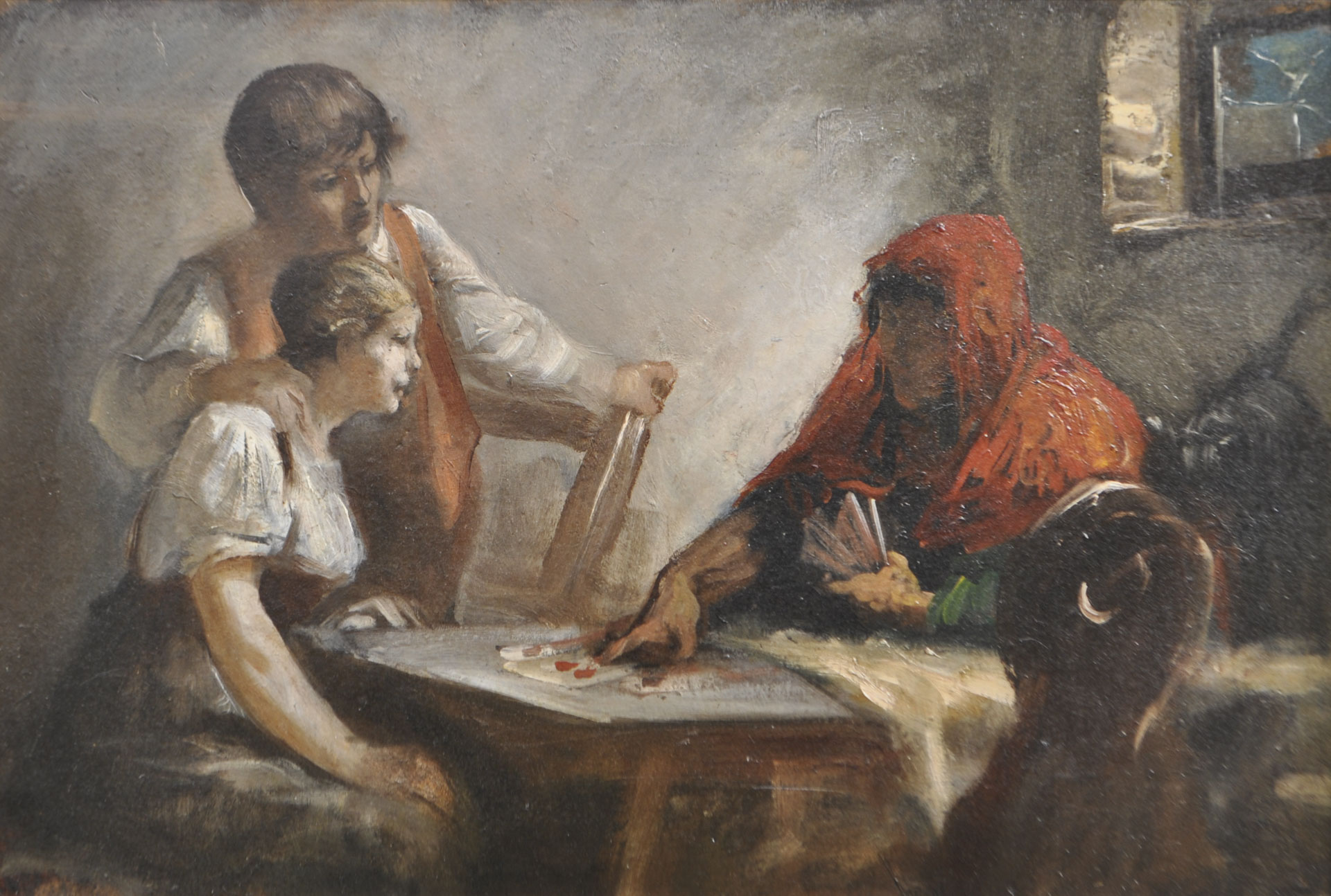 Karl Anrather (Margreid/Magrè 1861 – 1893) La chiromante;Olio su cartone, 36 x 53 cm